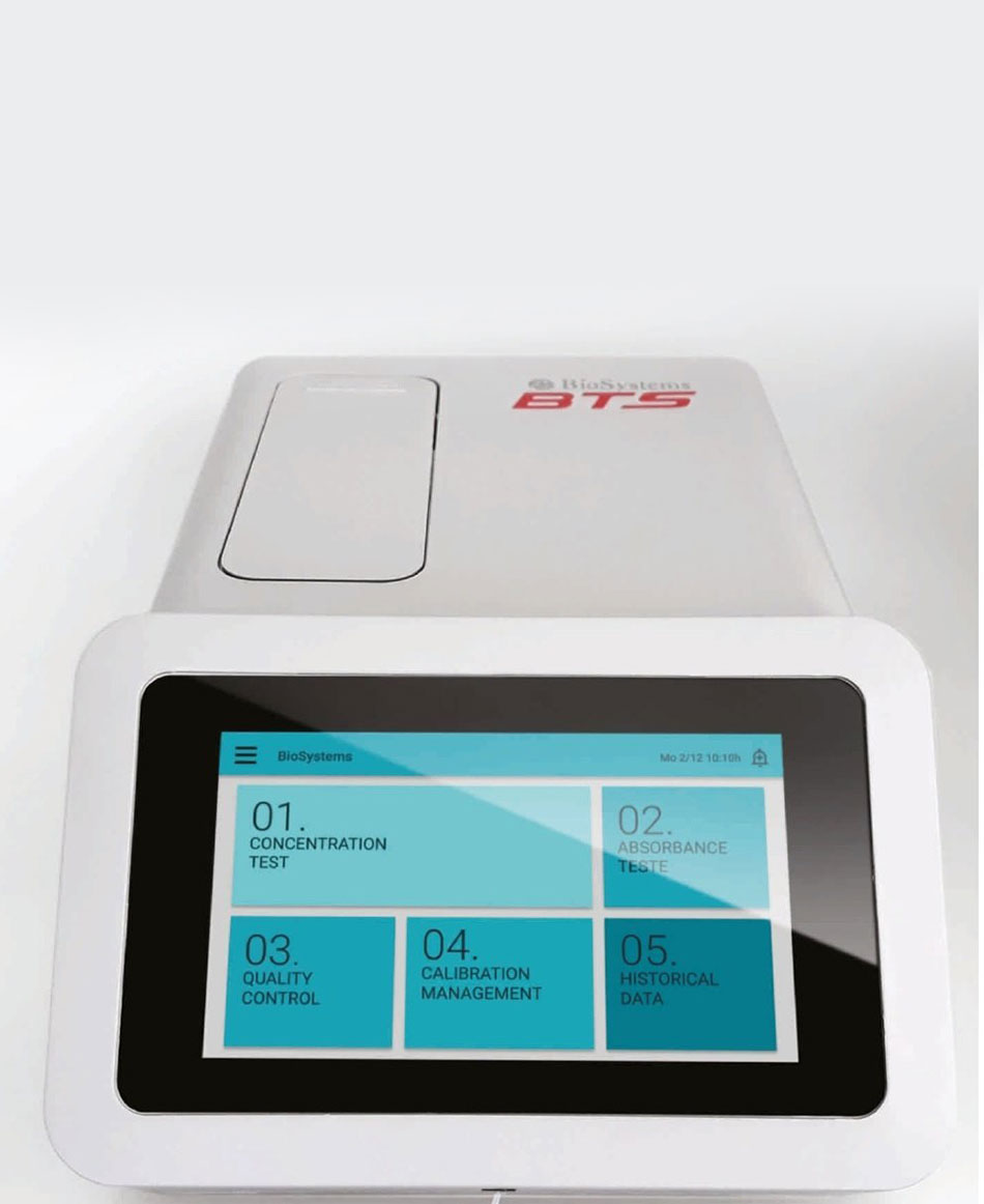 - ruebas programadas: Todas las pruebas de Biosystems. Nuevas pruebas adicionales: 10.000 nuevas pruebas (personalizadas por el cliente). Tiempos de incubación: De 5 a 9999 segundos. Tiempos de lectura: De 1 a 60 minutos (en técnicas cinéticas y tiempo fijo). Otras funciones: Fórmula para el ajuste de resultados / Comprobación